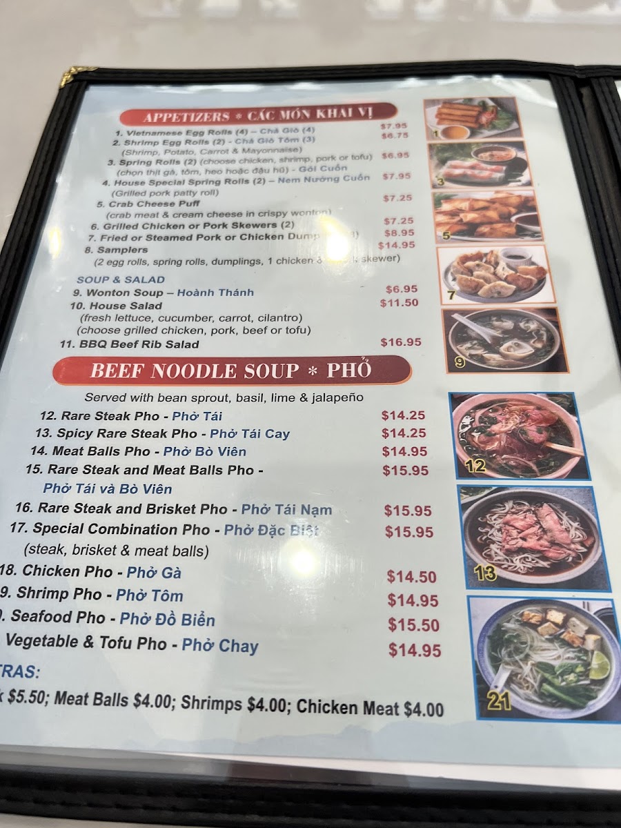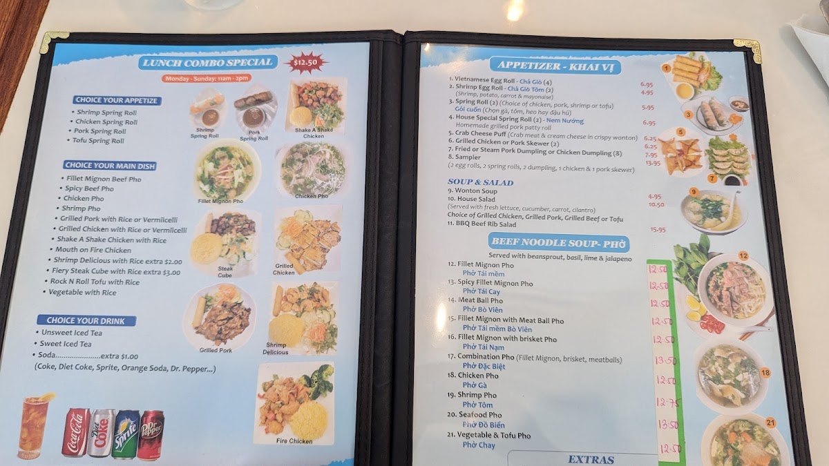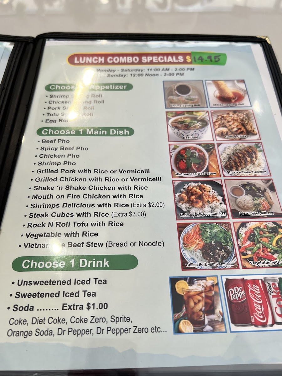 Spicy beef pho with choice of shrimp, chicken, pork, tofu spring roll, or egg roll. Choose iced tea, soda, or Dr Pepper.
