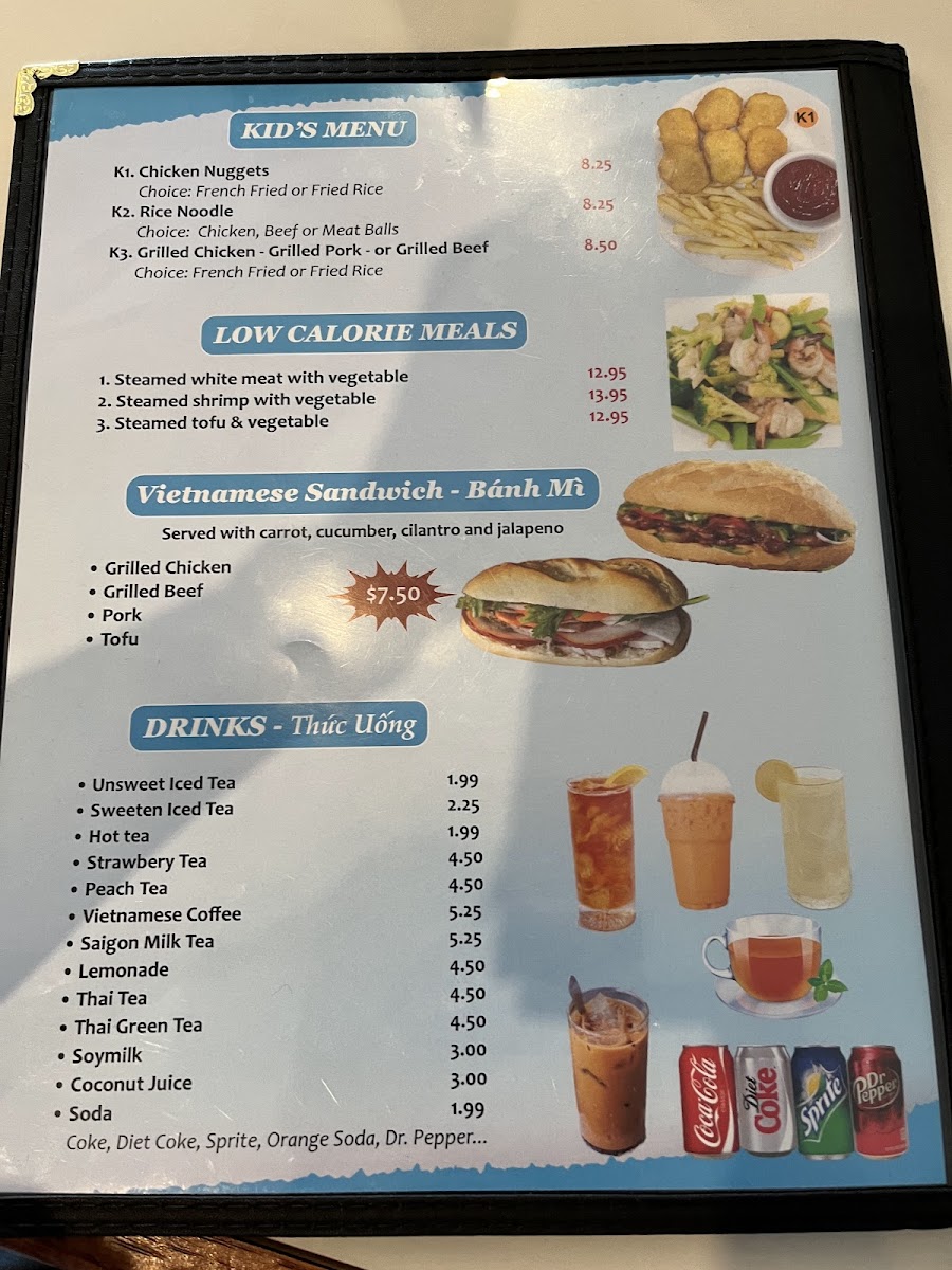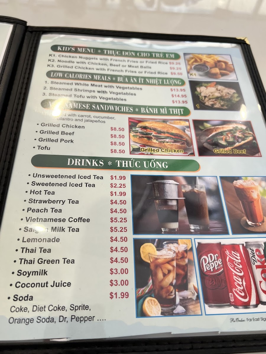 Vietnamese drinks menu featuring a selection of soda: Coke, Diet Coke, Sprite, Orange Soda, and Dr. Pepper.